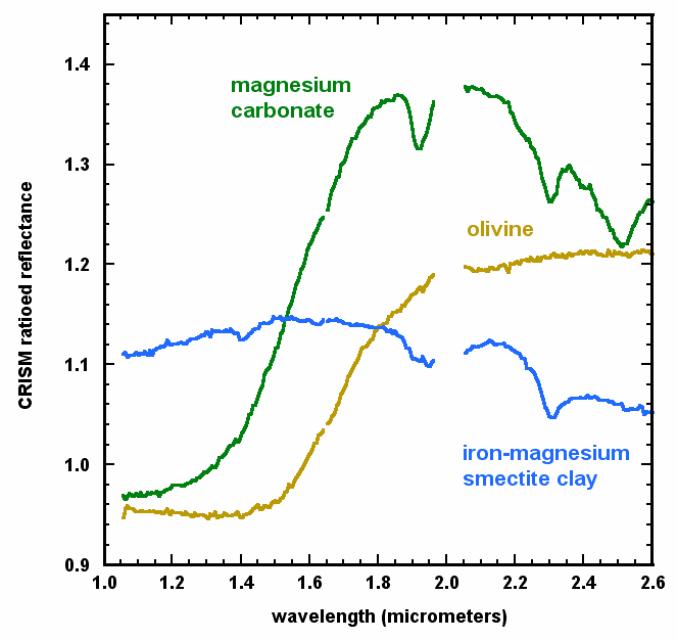 Iron-magnesium smectite clay is formed through alteration of rocks by liquid water and is characterized by distinctive absorptions at 1.4, 1.9, and 2.3 micrometers due to water (H2O) and OH in the atomic structure of the mineral. Olivine is an iron magnesium silicate and primary igneous mineral, and water is not in its structure. Its spectrum is characterized by a strong and broad absorption at 1.0 micrometer due to ferrous iron (Fe2+). Carbonate is an alteration mineral identified by the distinctive paired absorptions at 2.3 and 2.5 micrometers. The precise band positions at 2.31 and 2.51 micrometers identify the carbonate at this location as magnesium carbonate. The broad 1.0 micrometer band indicates some small amount of ferrous iron is also present and the feature at 1.9 micrometers indicates the presence of water. CRISM researchers believe the magnesium carbonate found in the Nili Fossae region formed from alteration of olivine by water.