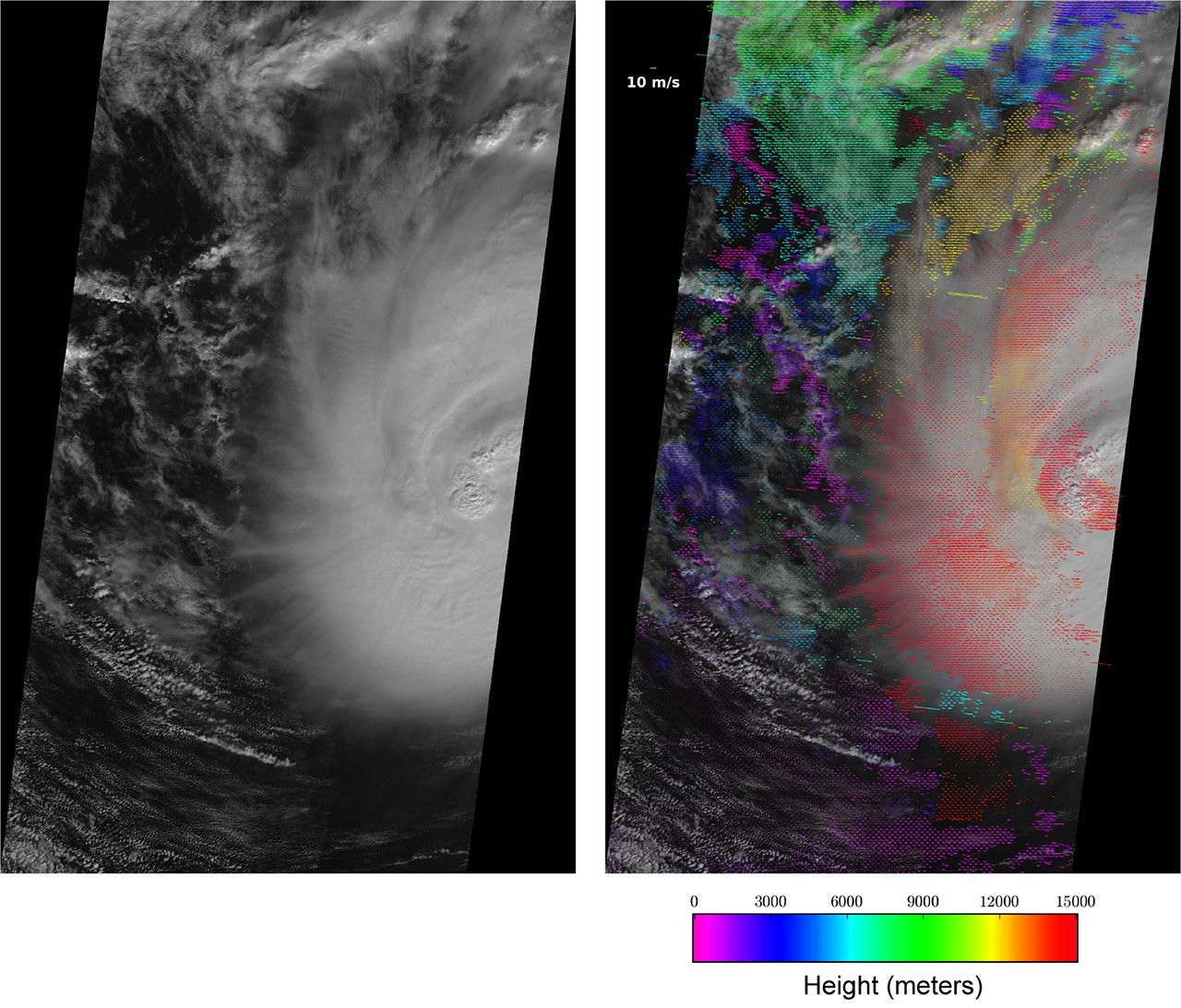 The first pair of images (figure 1) shows a visible image from MISR's nadir viewing camera, on the left, and a prototype retrieval of high-resolution (1.1 kilometers, or 0.7 miles) cross-track cloud motion heights and winds superimposed on this image on the right. The eye of Hurricane Ida is on the far right of the images and black regions indicate the extent of the MISR 380-kilometer-wide (236-mile-wide) image swath. North is toward the top of the images. The low clouds in the right image show the characteristic counterclockwise flow (from east to west for clouds north of the hurricane eye and the opposite to the south of the eye) associated with strong low pressure in the Northern Hemisphere. MISR uses a stereophotogrammetric technique to simultaneously retrieve the height and cross-track (east-west) motion of clouds. This technique relies on MISR's nine cameras that provide 275-meter (902-foot) resolution views of a single scene from different angles over a period of approximately seven minutes. An automatic pattern matching algorithm finds cloud top features that are common among the MISR camera images and determines the displacement of these features over time. Because the retrieval is purely geometric, the height assignment is very robust. For Hurricane Ida, the highest clouds are found at an altitude above 15 kilometers (9.3 miles) -- higher than a typical passenger aircraft flies. The prototype cross-track wind retrieval uses the time difference between different camera views to infer the motion of features orthogonal to the (north to south) motion of the satellite. The retrieval of both height and wind is done at a spatial resolution of 1.1 kilometers (0.7 miles). Observations of this type are extremely difficult to acquire from ground-based or airborne platforms.