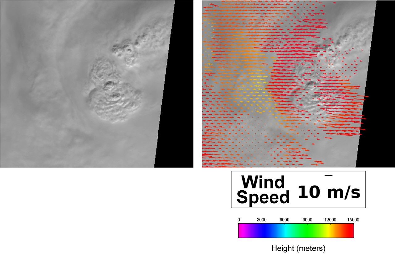 The second set of images (figure 2) shows the detail of the clouds near the hurricane eye. At the time of the satellite overpass, Ida's eye was "closed," meaning that it was covered by clouds, so the typical dark eye caused by descending air in the center of the hurricane vortex is not visible. In this case, however, strong thunderstorms nearly reaching the stratosphere are visible as "bubbles." Upon reaching the stratosphere, the tops of thunderstorms rapidly spread out, as shown in the image on the right. The clouds to the west of the strongest storms are moving toward the west, while the clouds to the east are moving east. The speed this motion retrieved by MISR ranges from 10 to 30 meters per second (36 to 108 kilometers, or 22 to 67 miles, per hour).
