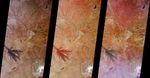 The distinctive fan-like feature on the left of each image is the highly vegetated Okavango Delta, a mosaiced network of grasslands and water channels, observed here during the dry season. The town of Maunis at its southeastern edge. Note how the plant life, which is highly reflective in the near-infrared, shows up as bright red in the middle image. Vegetation also preferentially reflects light back toward the source of illumination, so in the right image, the Df camera image, which is displayed in green, is brighter in this region.