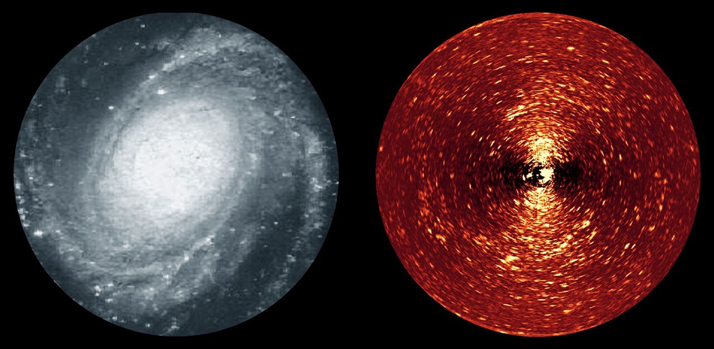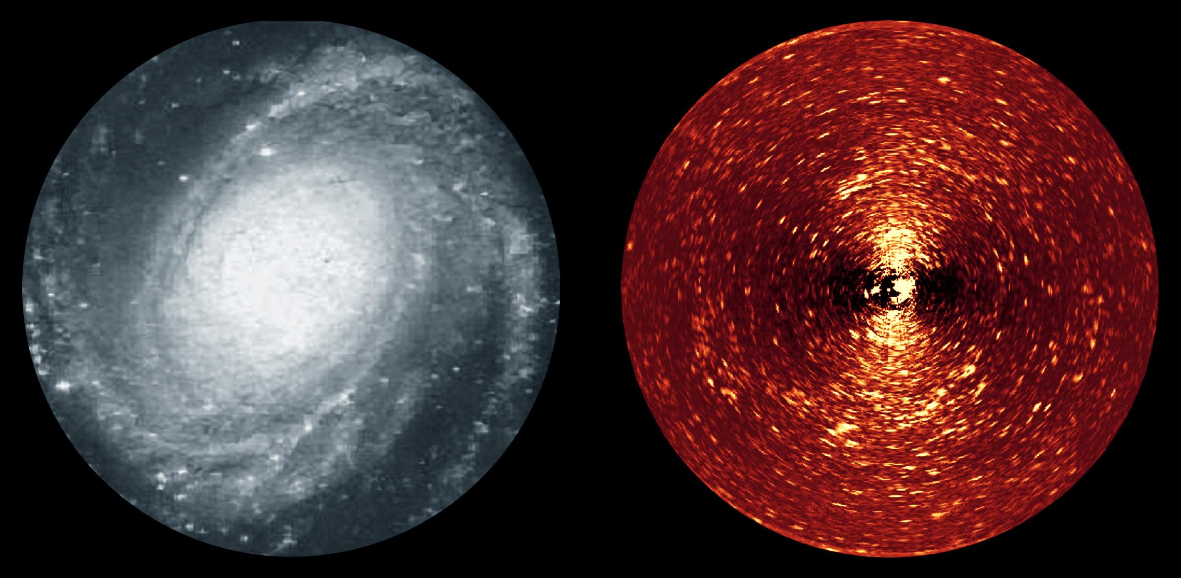 Observing the galaxy in the infrared is the only way to directly see the youngest stars, since the shroud of dust and gas that surrounds them is opaque to visible light, but transparent in the IR. Even so, the unprocessed infrared image was still dominated by the light from the smooth, older disk of the galaxy rather than the faint tracks of young stars. Further processing using a mathematical technique called Fourier filtering allowed the team to pick out structures on the physical scale on which star formation occurs, revealing these streams of young stars flowing away from their stellar nurseries.