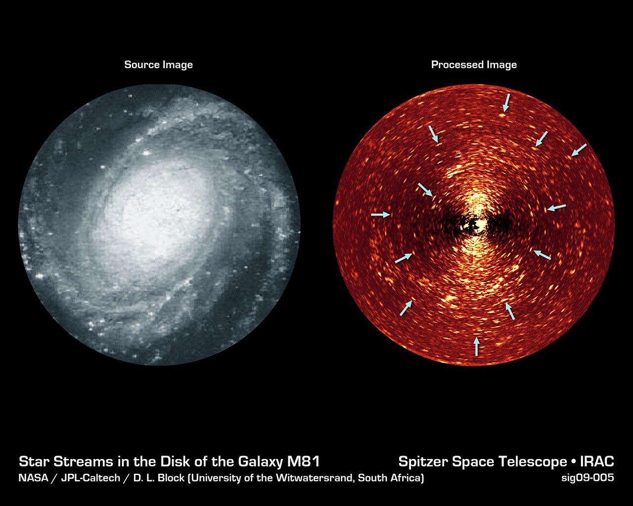 Here we see two different views of the spiral galaxy, Messier 81. On the left is an image taken in blue light, while on the right is a specially-processed version of an image taken with the Spitzer Space Telescope's infrared array camera (IRAC) at 4.5 microns. The processed image reveals myriads of tiny arclets, a representative sample of which are arrowed. Each of these arclets represents a young star stream in the disk of the galaxy.
