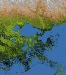 About the image: The geography of the New Orleans and Mississippi delta region is well shown in this radar image from the Shuttle Radar Topography Mission. In this image, bright areas show regions of high radar reflectivity, such as from urban areas, and elevations have been coded in color using height data also from the mission. Dark green colors indicate low elevations, rising through yellow and tan, to white at the highest elevations.