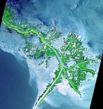 As the Mississippi River enters the Gulf of Mexico, it loses energy and dumps its load of sediment that it has carried on its journey through the mid continent. This pile of sediment, or mud, accumulates over the years building up the delta front. As one part of the delta becomes clogged with sediment, the delta front will migrate in search of new areas to grow. The area shown on this image is the currently active delta front of the Mississippi. The migratory nature of the delta forms natural traps for oil. Most of the land in the image consists of mud flats and marsh lands. There is little human settlement in this area due to the instability of the sediments. The main shipping channel of the Mississippi River is the broad stripe running northwest to southeast.