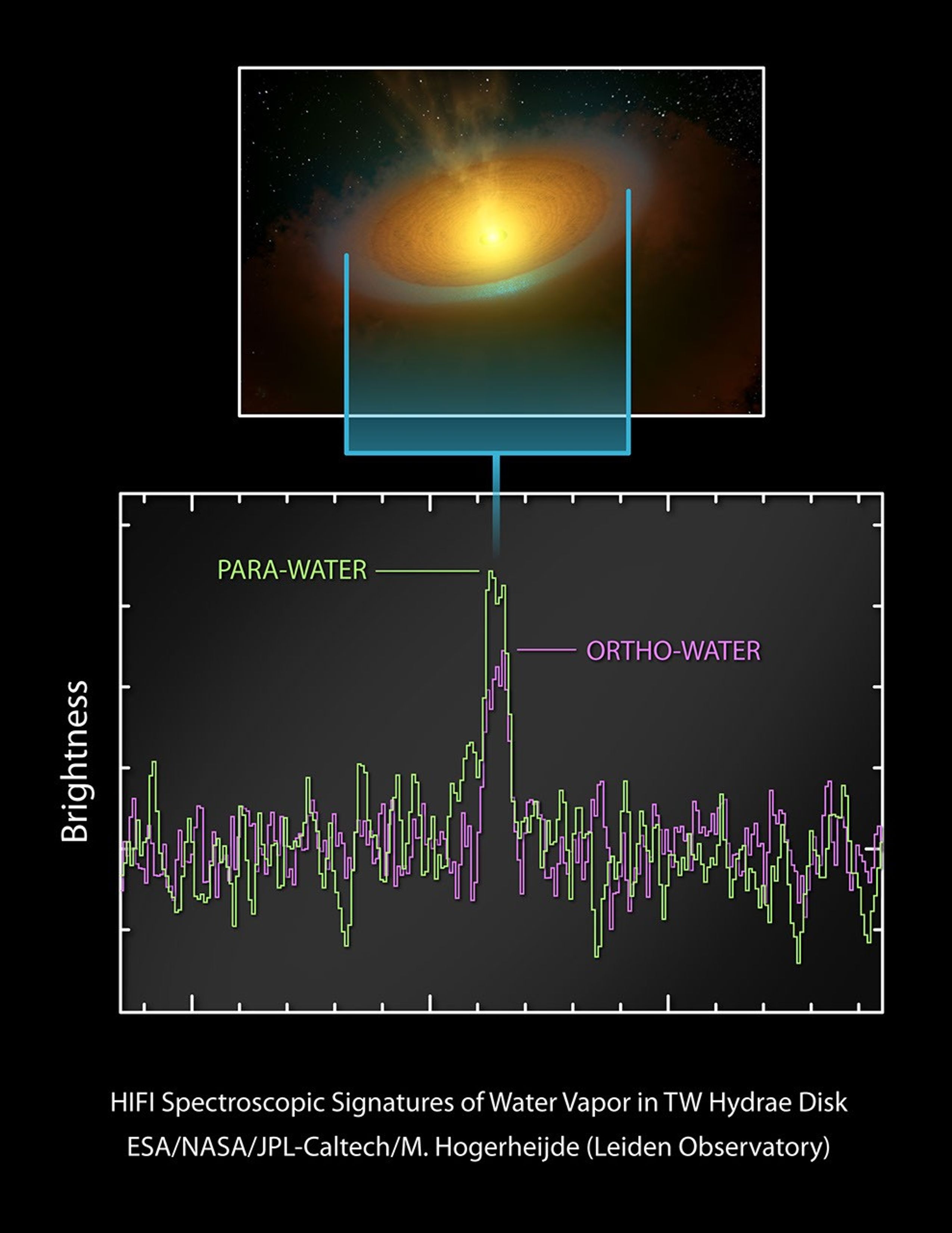 The graph of data (Figure 1) from Herschel shows how the cool water vapor was detected. Water molecules come in two "spin" forms, called ortho and para, in which the two spins of the hydrogen nuclei have different orientations. In this case, the team compared the ratio of ortho to para water seen in the TW Hydrae disk to that in comets, and found very low values. Lower ratios indicate cooler temperatures, though in practice the analysis is much more complicated. This is the first demonstration that water exists in large quantities in the frigid, outer regions of solar systems, where comets take shape.