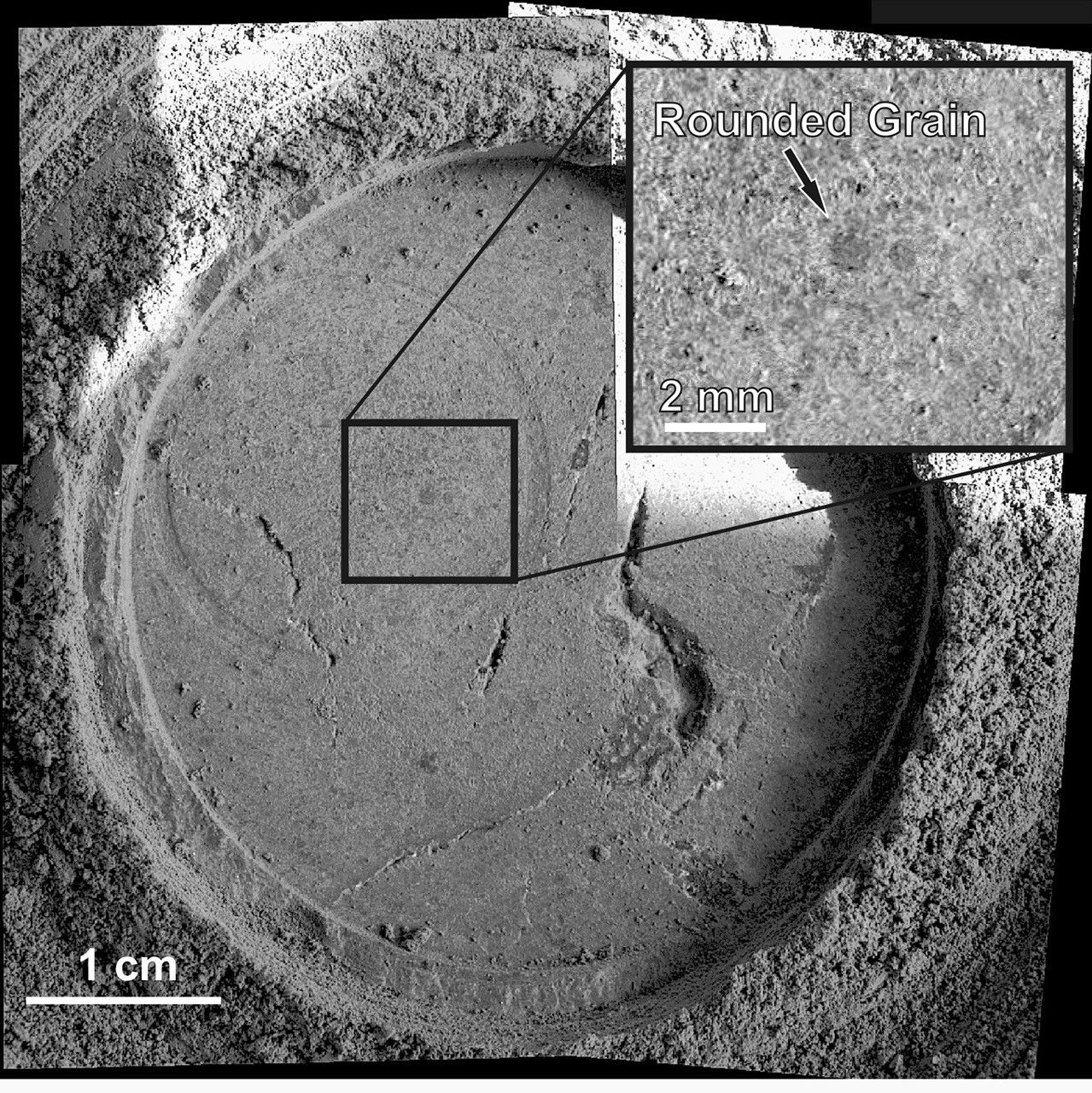 Close-up examination of a freshly exposed area of a rock called "Uchben" in the "Columbia Hills" of Mars reveals an assortment of particle shapes and sizes in the rock's makeup. NASA's Mars Exploration Rover Spirit used its microscopic imager during the rover's 286th martian day (Oct. 22, 2004) to take the frames assembled into this view. The view covers a circular hole ground into a target spot called "Koolik" on Uchben by the rover's rock abrasion tool. The circle is 4.5 centimeters (1.8 inches) in diameter. Particles in the rock vary in shape from angular to round, and range in size from about 0.5 millimeter (0.2 inch) to too small to be seen. This assortment suggests that the rock originated from particles that had not been transported much by wind or water, because such a transport process would likely have resulted in more sorting of the particles by size and shape.