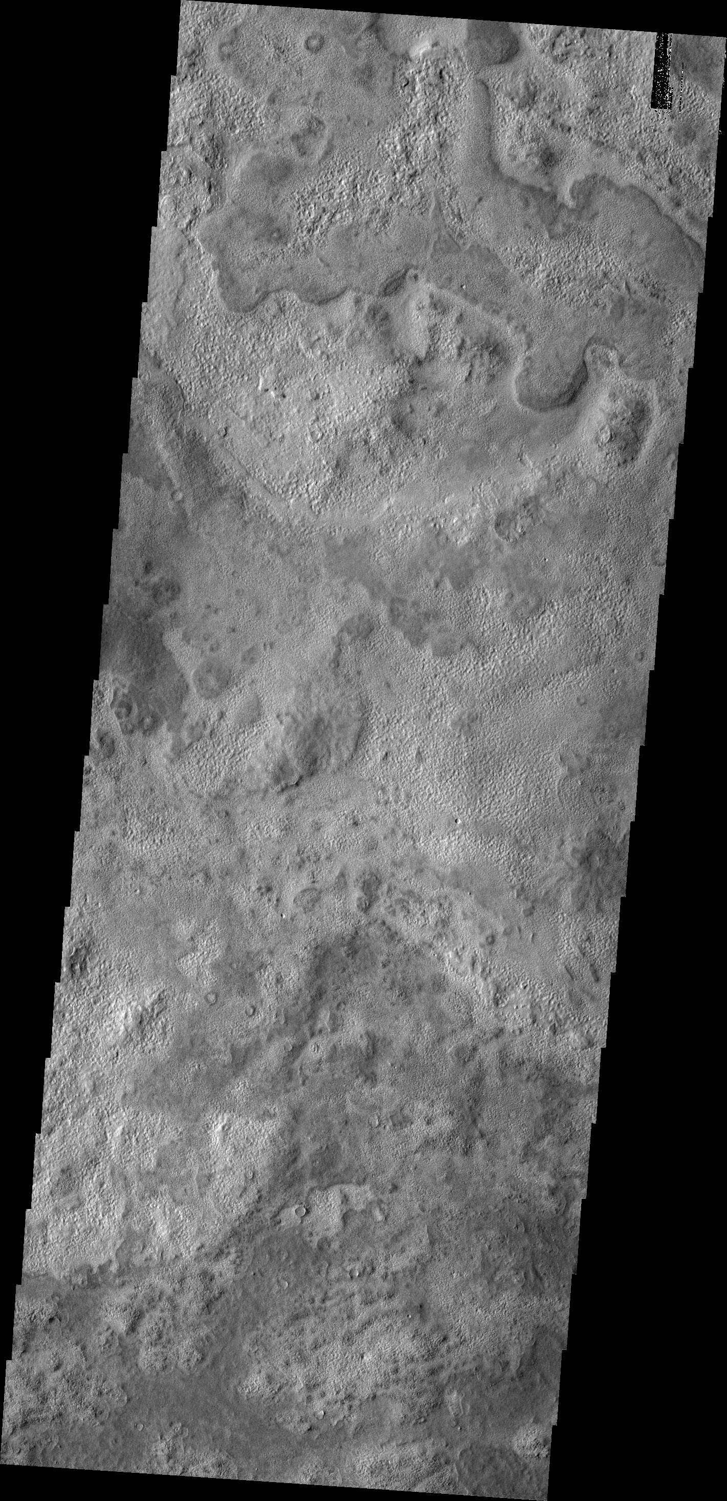 Note: this THEMIS visual image has not been radiometrically nor geometrically calibrated for this preliminary release. An empirical correction has been performed to remove instrumental effects. A linear shift has been applied in the cross-track and down-track direction to approximate spacecraft and planetary motion. Fully calibrated and geometrically projected images will be released through the Planetary Data System in accordance with Project policies at a later time.