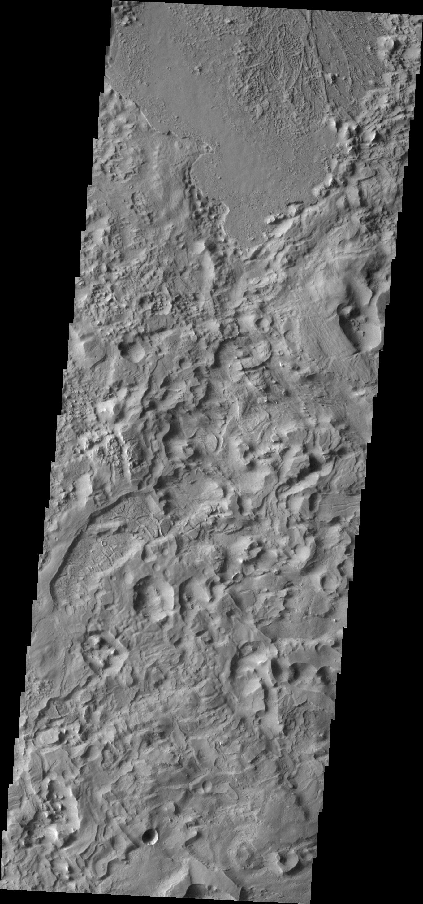 This image of the western Tharsis region contains many different surface textures. Both volcanism and wind action have played a part in producing the interesting mix of textures seen in this VIS image.