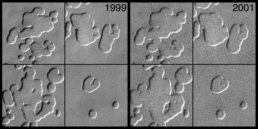 Compare each image on the left with their counterparts on the right. Small hills vanished and pit walls expanded between 1999 and 2001. The pits are formed in frozen carbon dioxide, and the carbon dioxide is subliming away a little more each Martian year. Sunlight illuminates each of the four different scenes from the upper left.