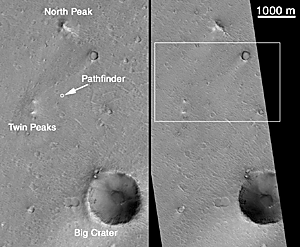 An attempt to photograph the Pathfinder site was made once before, in April 1998, by turning the entire MGS spacecraft so that the camera could point at the known location of the Mars Pathfinder lander. Turning the MGS spacecraft like this is not a normal operation -- it takes considerable planning, and disrupts the on-going, normal acquisition of science data. It took 3 attempts to succeed, but on April 22, 1998, MOC acquired the picture seen on the left side of Figure A, above. The three near-by major landmarks that were visible to the Pathfinder's cameras are labeled here (North Peak, Big Crater, Twin Peaks). It was known at the time that this image was not adequate to see the Pathfinder lander because the camera was not in focus and had a resolution of only 3.3 meters (11 ft) per pixel. In this and all other images shown here, north is up. All views of the 1998 MOC image are illuminated from the lower right, all views of the 2000 MOC image are illuminated from the lower left.