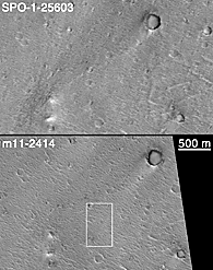 Figure B (above) shows a subsection of both the 1998 image (top, labeled SPO-1-25603) and the 2000 image (bottom, labeled m11-2414) projected at a scale of 3 meters (10 ft) per pixel. At this scale, the differences in camera focus and sunlight illumination angle are apparent, with the January 2000 image being both in focus and having better lighting conditions. In addition, the MGS spacecraft took the 2000 image from a lower altitude than in 1998, thus the image has better spatial resolution overall. The 500 m scale bar is equal to about 547 yards. The white box shows the location of images in Figure C, below.