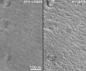 The third figure (C, above) again shows portions of the April 1998 image (C, left) and January 2000 image (C, right), only this time they have been enlarged to a resolution of 0.75 meters (2.5 ft) per pixel. The intrinsic resolution of the January 2000 image is 1.5 meters (5 ft), so this is a 200% expanded view of the actual M11-02414 image. The circular features in this and the previous images are impact craters in various states of erosion. Some boulders (dark dots) can be seen near the crater in the lower left corner. The texture that runs diagonally across the scene from upper left toward lower right consists of ridges created by the giant floods that washed through the Pathfinder site from Ares and/or Tiu Vallis many hundreds of millions of years ago. These ridges and the troughs between them were also seen by the Pathfinder lander; their crests often covered with boulders and cobbles (which cannot be seen at the resolution of the MOC image). The 100 m scale bar is equal to 109 yards (which can be compared with a 100 yard U.S. football field). The Mars Pathfinder landing site is located near the center of this view.
