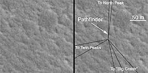 Can Mars Global Surveyor's 1.5 meter (5 ft) per pixel camera be used to find any evidence as to the fate of the Mars Polar Lander that was lost on December 3, 1999? One way to find out is to look for one of the other Mars landers and determine what, if anything, can be seen. There have been three successful Mars lander missions: Viking 1 (July 1976), Viking 2 (September 1976), and Mars Pathfinder (July 1997). Of these, the location of Mars Pathfinder is known the best because there are several distinct landmarks visible in the lander's images that help in locating the spacecraft. The MGS MOC Operations Team at Malin Space Science Systems has been tasked since mid-December 1999 with looking for the lost Polar Lander. Part of this effort has been to test the capabilities of MOC by taking a picture of the landing site of Mars Pathfinder.