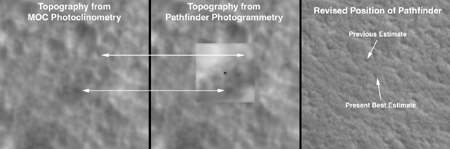 ![]() (E) Photoclinometry, Topography, and Revised Landing Site Location. ![]() (F) Mars Pathfinder Landing Site; lander not resolved by MOC. |