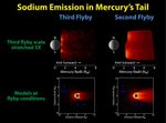 Comparisons of the neutral sodium observed during the second and third Mercury flybys to models are shown in this figure. The top left and right panels show the same observations as the image released Tuesday, but the color scale for the third flyby has been stretched to show the distribution of sodium more clearly. As in previous flybys, the distinct north and south enhancements in the emission that result from material being sputtered from the surface at high latitudes on the dayside are seen. The lower two panels show Monte Carlo models of the sodium abundance in Mercury's exosphere for conditions similar to those during the two flybys. These models illustrate that the "disappearance" of Mercury's neutral sodium tail is consistent with the change in conditions. Observations of the sodium exosphere and tail throughout Mercury's orbit during MESSENGER's orbital mission phase will enable such "seasonal" effects to be studied. Refinement of models similar to these will lead to an improved understanding of the source and loss processes and their variations among Mercury's different exospheric "seasons."