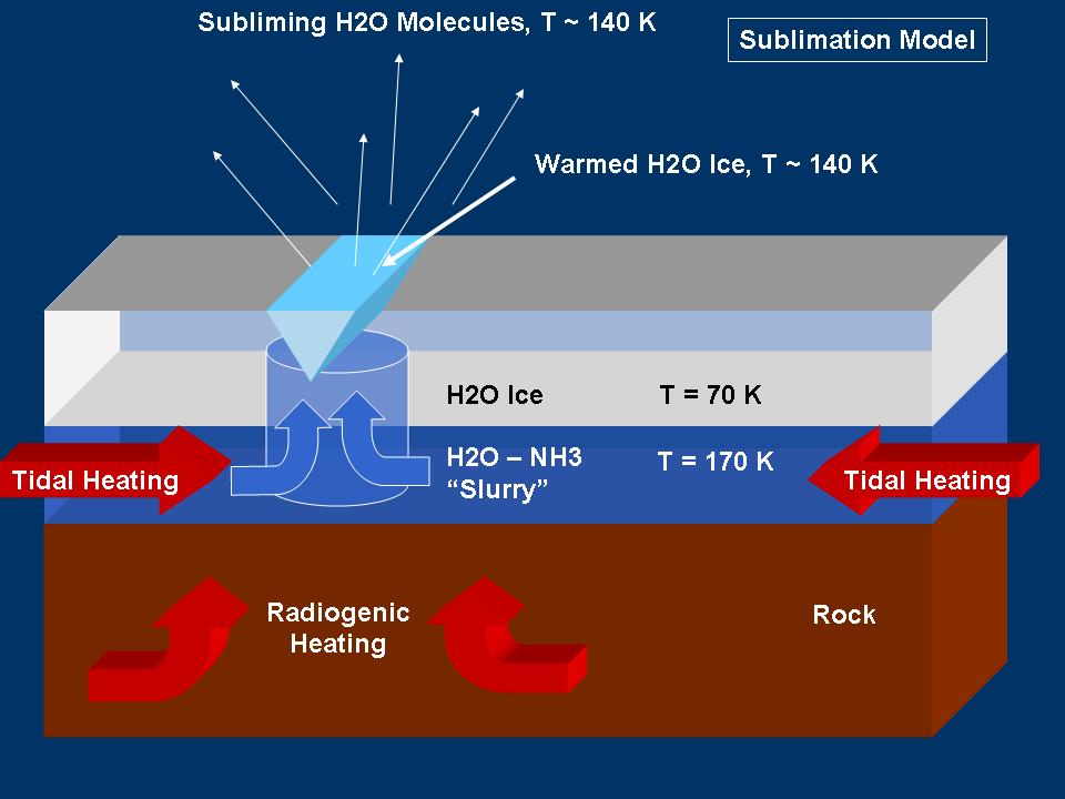 This graphic represents a possible model for mechanisms that could generate the water vapor and tiny ice particles detected by Cassini over the southern polar terrain on Enceladus. This model shows sublimation of warmed surface ice. Sublimation is to cause to change directly from a solid to a gas, or from a gas to a solid, without becoming a liquid.