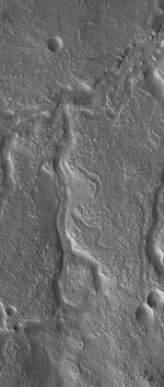 Covered by an eroded mantle of--perhaps--cemented dust, this Mars Global Surveyor (MGS) Mars Orbiter Camera (MOC) image shows part of a network of ancient valleys in northern Arabia Terra near Moreux Crater. The valleys may have originally been carved by a liquid such as water. The scene is located near 40.6°N, 316.4°W. The rugged surface of this mantled scene is a common feature at middle latitudes in both hemispheres of Mars. Some science investigators in the past several years have speculated that ice was once present in such mantles, and that the ice must have sublimed away to create the texture. The image covers an area about 3 km (1.9 mi) wide and is illuminated by sunlight from the lower left.