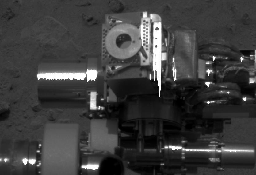 This close-up image of the Mars Exploration Rover Spirit's instrument deployment device, or "arm," shows the donut-shaped plate on the Moessbauer spectrometer. This image makes it easy to recognize the imprint left by the instrument in the martian soil at a location called "Peak" on sol 43 (February 16, 2004). This image was taken by the rover's panoramic camera on sol 39 (February 11, 2004).