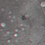 This 3-D image taken by the microscopic imager onboard the Mars Exploration Rover Opportunity shows a circular imprint left in the Meridiani Planum soil by the rover's Moessbauer spectrometer, an instrument located on its arm that detects iron-bearing minerals. Scientists are studying the curiously rounded grains for clues about the soil's history. The observed area is 3 centimeters (1.2 inches) across.