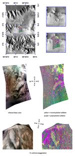 The lower two images are renderings of data draped over topography with 7 times vertical exaggeration. These images provide a view of the topography and reveal how the sulfate deposits both cover and flank the ridge. Brighter, monohydrated sulfate (yellow) deposits revealed in the lower right image lies along the ridge's northwest side and fall off into a small valley or depression, while darker polyhydrated sulfates (purple) lie along the ridge's northeast flank. A deposit of both mono- and polyhydrated sulfates spanning the ridge near its crest also appears to be coarsely banded.