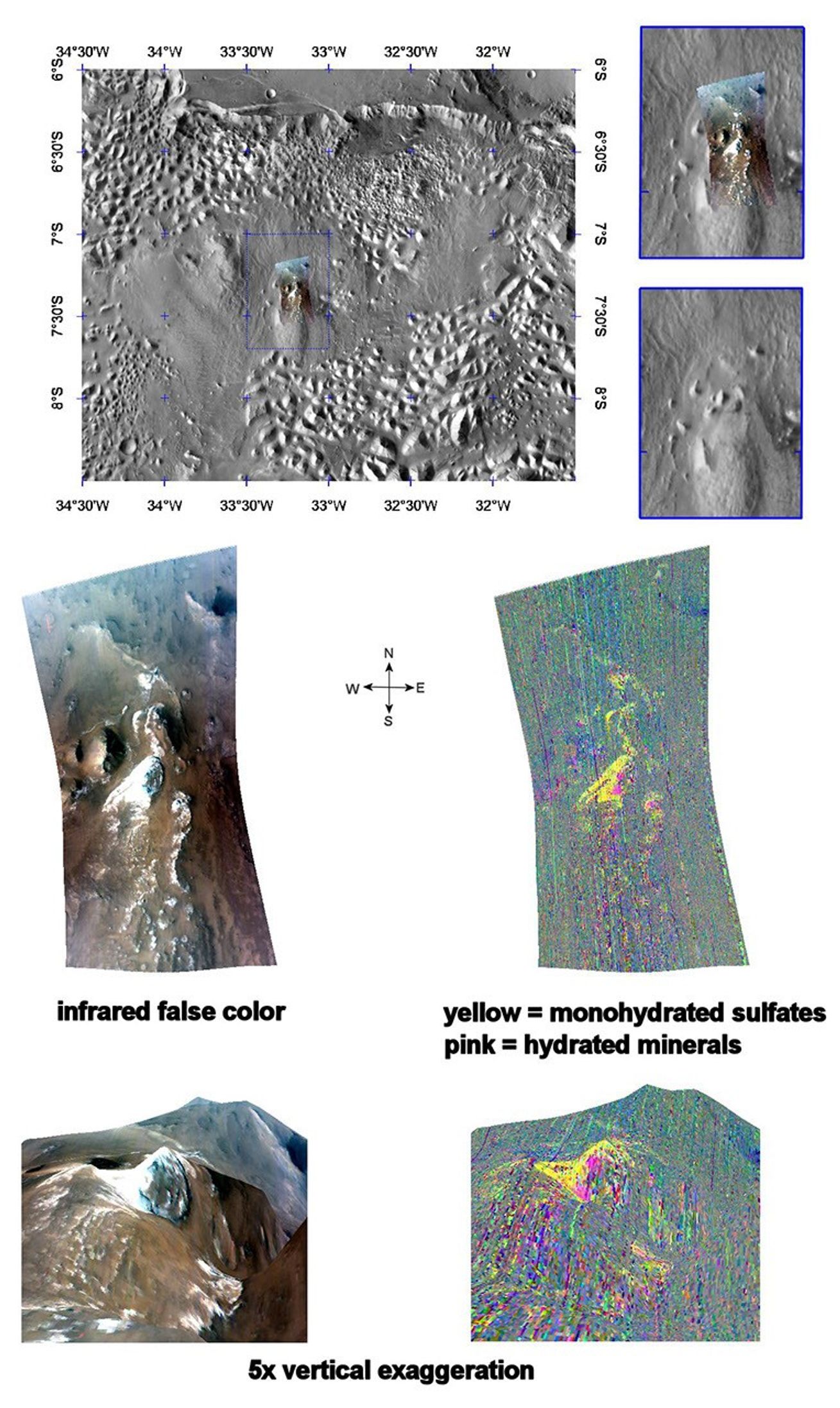 The center left image, an infrared false color image, reveals a swath of light-colored material draped over the knobs. The center right image unveils the mineralogical composition of the area, with yellow representing monohydrated sulfates (sulfates with one water molecule incorporated into each molecule of the mineral).
