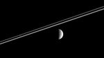 Distant Rhea (right) poses here for the Cassini spacecraft, as Pandora hovers against Saturn's dark shadow on the rings.