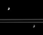 Saturn's expansive rings separate the moon's Tethys (at the top) from Dione (at the bottom). Even in this distant view, it is easy to see that the moons' surfaces, and likely their evolutionary histories, are very different.