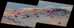 NASA's Mars Exploration Rover Spirit will not plant a flag, as did Sir Edmund Hillary when he scaled Mount Everest on Earth, when the rover reaches the hilltop outcrop shown here, which scientists have nicknamed in honor of Hillary. But Spirit will send images and other scientific data across the millions of miles that separate Earth from the distant planet where no human has yet set foot. This false-color view combines images that Spirit took with its panoramic camera during the rover's 608th martian day, or sol (Sept. 18, 2005). The site is on top of "Husband Hill" inside Gusev Crater, where the rover has been conducting scientific studies. The component images were taken through the camera's 750-nanometer, 530-nanometer and 430-nanometer filters.