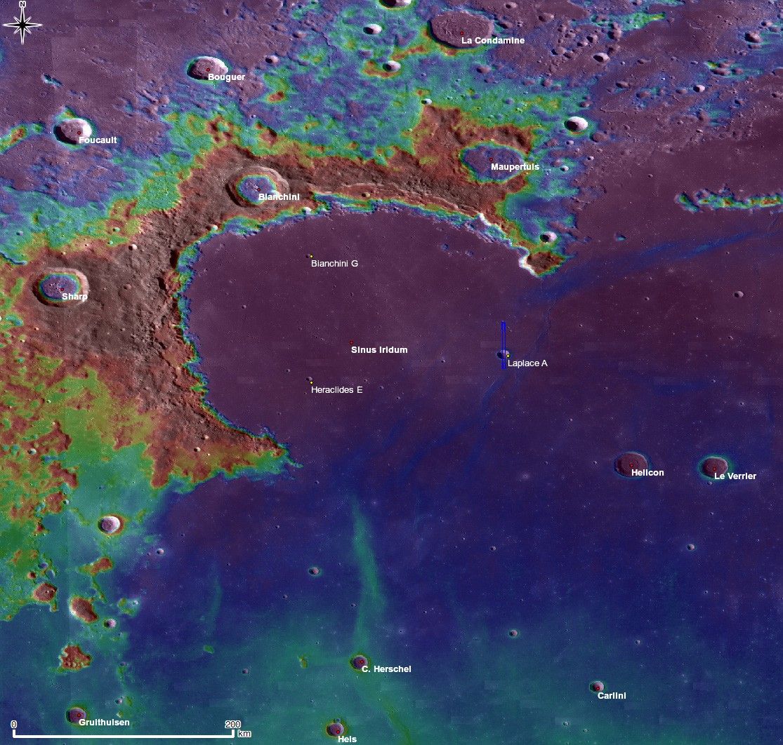 Context map around Laplace A crater. Image center location is 42.57°N, -29.73°E. LROC WAC 100 m/pix mono-chrome global mosaic overlayed by WAC color DTM 500 m/px. Blue long box at the image center corresponds to the footprint of today's featured NAC image