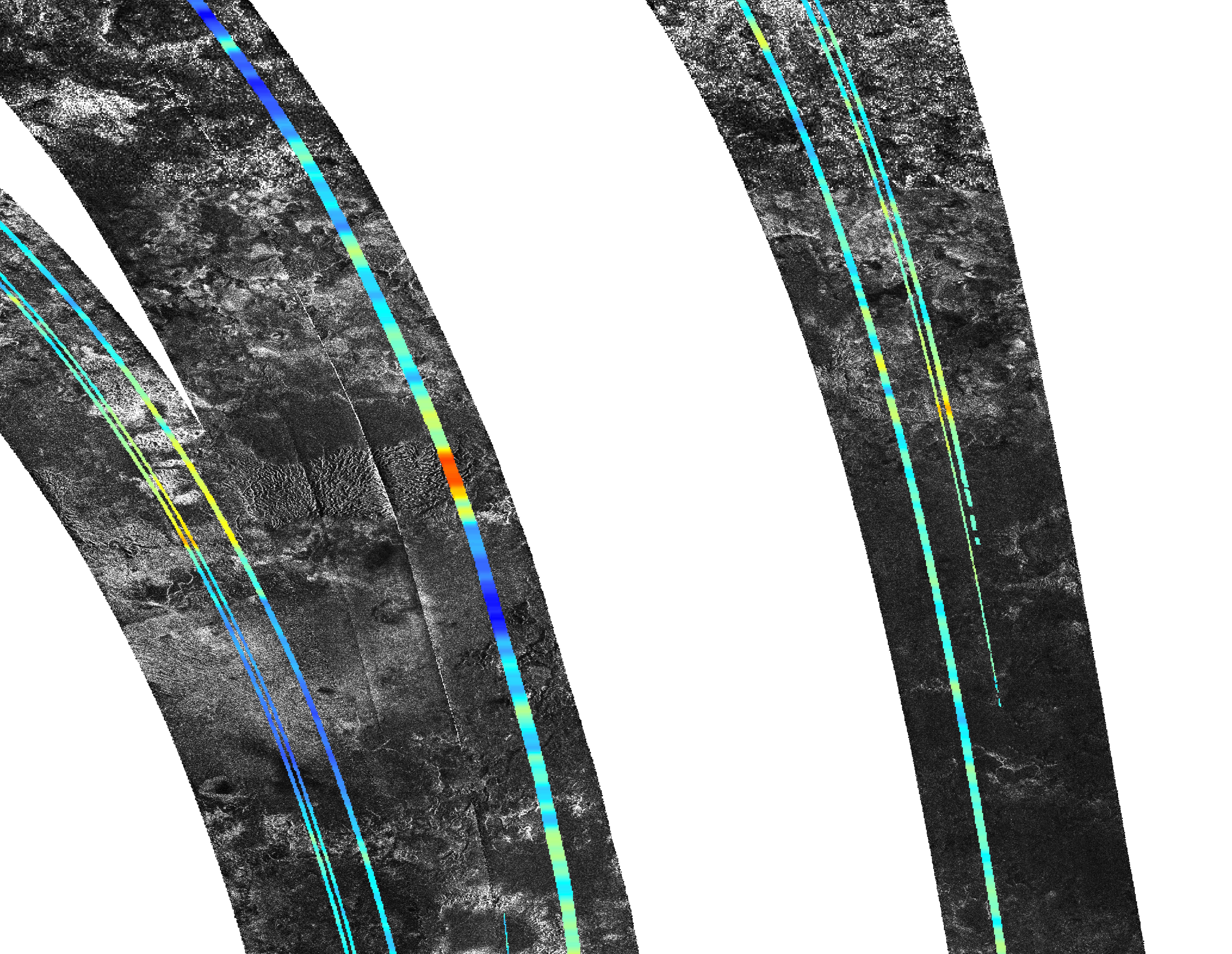 Cassini's radar instrument obtained the black and white images making up the mosaic on July 22, Sept. 22, and Oct. 9, 2006. In radar images, objects appear bright when they are tilted toward the spacecraft or have rough surfaces. The topographical data were derived from the same flybys.
