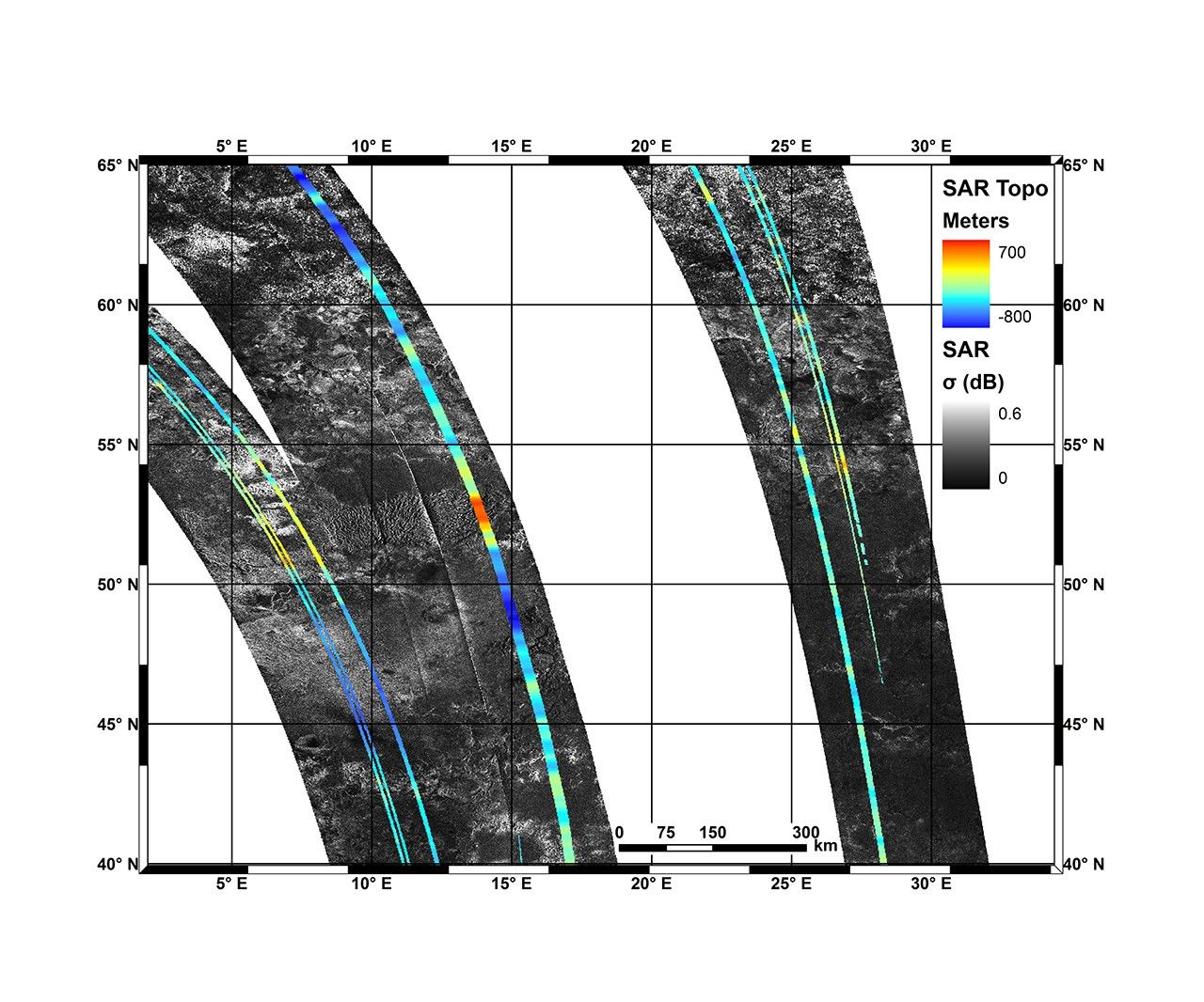 This mosaic, made from radar images obtained by NASA's Cassini spacecraft, shows mountainous terrain on Saturn's moon Titan in the moon's northern hemisphere, north of the Aaru region. The annotated version shows topographic profiles measured by the radar instrument, with red-orange areas showing the highest elevation (in this image, 600 meters, or 2,000 feet, above the mean radius of Titan) and purple showing the lowest (in this image, 800 meters, or 2,600 feet, below the mean radius of Titan). That version also shows a grid for latitude and longitude. This region presents a mountain block near 52 degrees north latitude and 13 degrees east longitude.