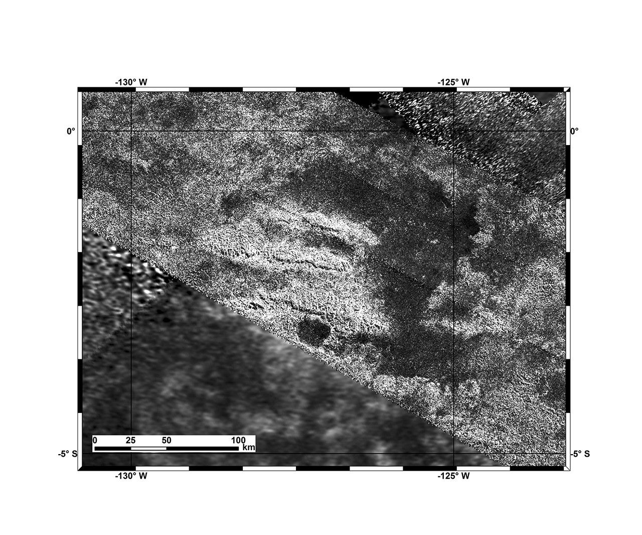 Cassini's radar instrument obtained the images on Feb. 15, 2005 and May 12, 2008. In radar images, objects appear bright when they are tilted toward the spacecraft or have rough surfaces.