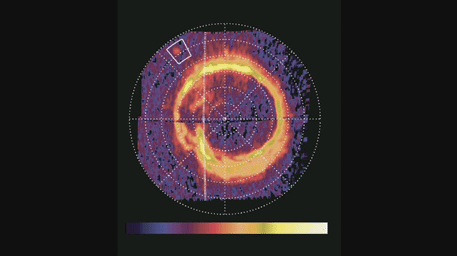 The three spot detections in the movie were obtained by Cassini's ultraviolet imaging spectrograph on at 8:00 p.m. and 9:20 p.m. PST on Aug. 25, 2008, and 1:02 a.m. PST on Aug. 26 (3:00 a.m., 4:20 a.m. and 8:02 a.m. UTC on Aug. 26), a period of time spanning five hours and two minutes. The footprint moved according to changes in the position of Enceladus. In the image, the colors represent how bright the extreme ultraviolet emissions are. The lowest emission areas (one to two extreme ultraviolet counts per pixel) are in black/blue. The brightest emission areas (500 to 1,000 extreme ultraviolet counts per pixel) are in yellow/white.
