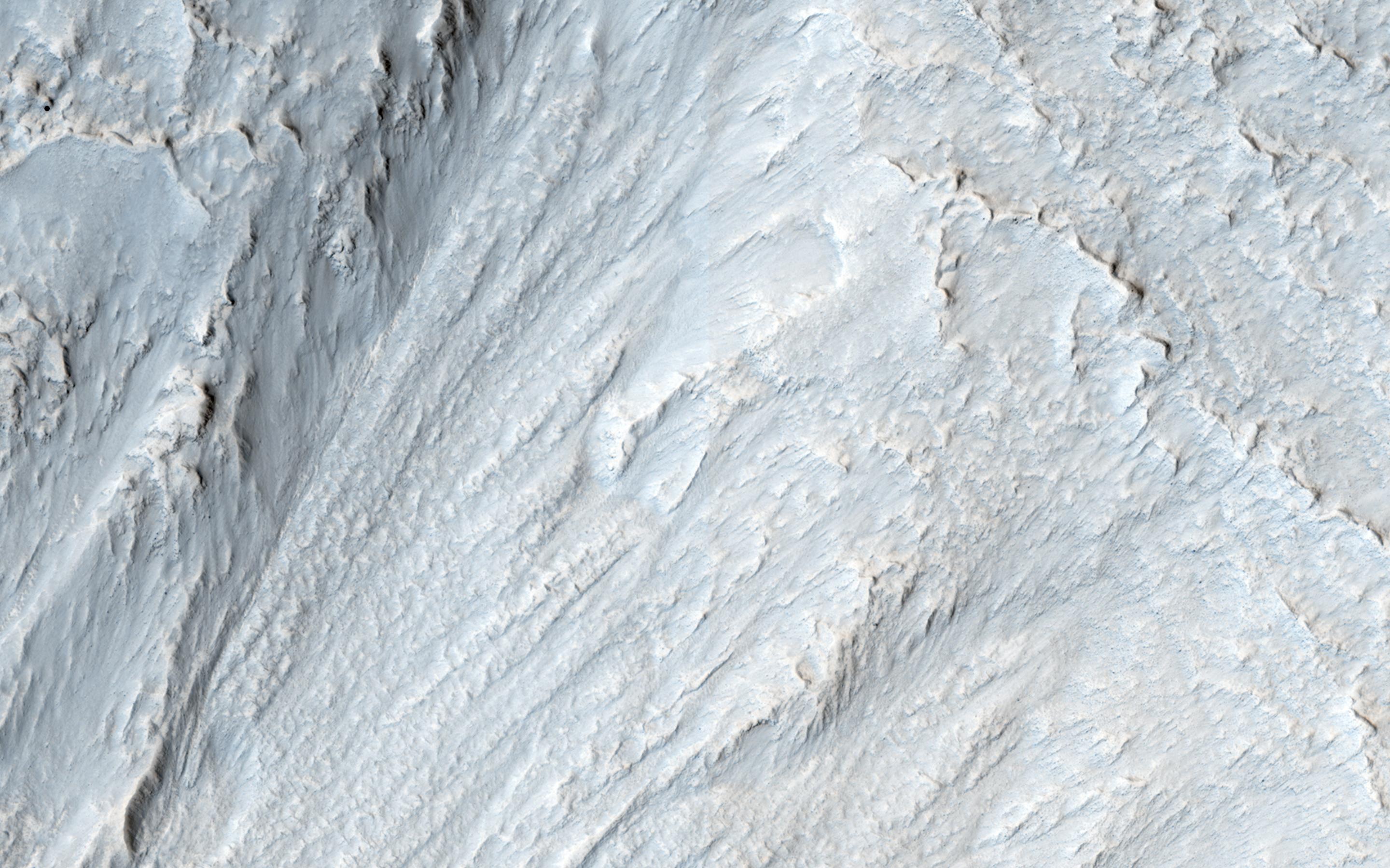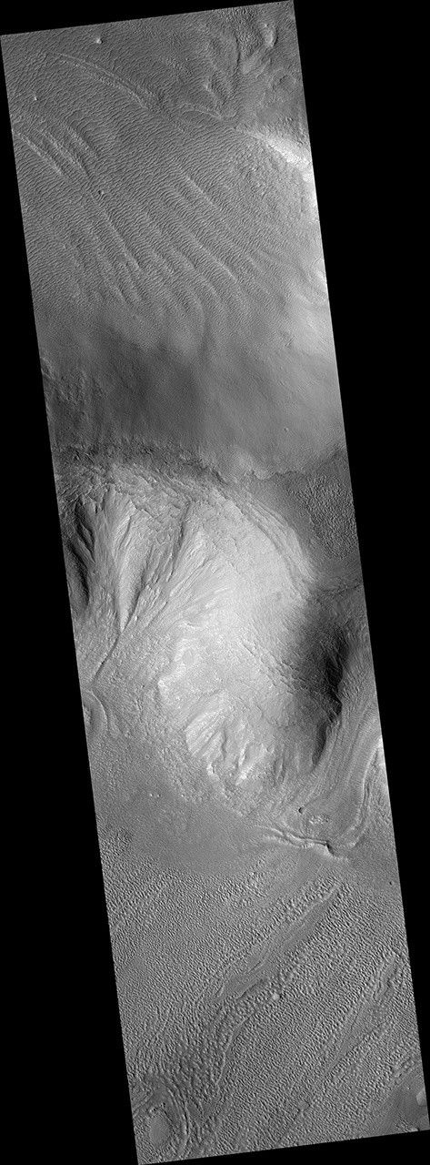 This image appears to show some type of mass movement of material down the wall of a mesa in Deuteronilus Mensae. Also visible is an arc-shaped ridge at the end of the valley.