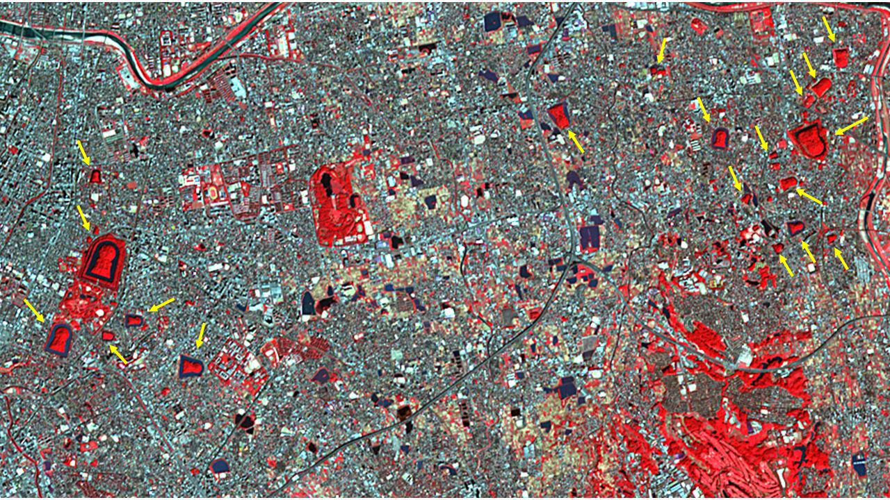 The Mozu Tombs are a group of megalithic tombs in Sakai, Japan, in the Osaka Plain. The largest tomb, the Daisenryo Kofun, was thought to have been built in the 5th century for the Emperor Nintoku. It is keyhole-shaped, surrounded by a moat, and is 840 meters long. Nineteen other tombs are marked on the image. It was acquired October 27, 2011, covers an area of 7.8 by 13.9 km, and is located at 34.6 degrees north, 135.5 degrees east.