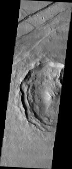 Note: this THEMIS visual image has not been radiometrically nor geometrically calibrated for this preliminary release. An empirical correction has been performed to remove instrumental effects. A linear shift has been applied in the cross-track and down-track direction to approximate spacecraft and planetary motion. Fully calibrated and geometrically projected images will be released through the Planetary Data System in accordance with Project policies at a later time.