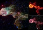The large composite image above is a product of combining data from the observatory's multiband imaging photometer and the infrared array camera. The thermal emission at 24 microns measured by the photometer (red) is combined with near-infrared emission from the camera at 3.6/4.5 microns (blue) and from 5.8/8.0 microns (green). The colors of the diffuse emission and filaments vary, and are a combination of molecular hydrogen (which tends to be green) and polycyclic aromatic hydrocarbon (brown) emissions.
