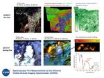 The bottom row in the compilation shows data acquired from the Thomas fire in progress in December 2017. At bottom left is a visible wavelength image. The bottom middle image is an infrared image, with red at 2,250 nanometers showing fire energy, green at 1,650 nanometers showing the surface through the smoke, and blue at 1,000 nanometers showing the smoke itself. The image at bottom right is a fire temperature map using spectroscopic analysis to measure fire thermal emission recorded in the AVIRIS spectra.