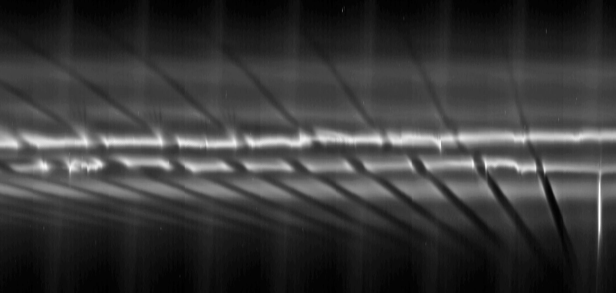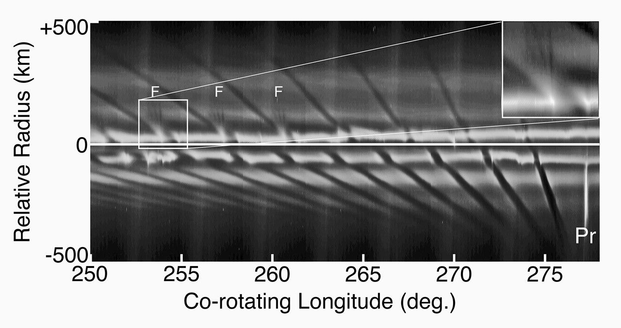 The diagonal streamer-channels are periodically created by the gravity of the potato-shaped moon Prometheus which is 148 kilometers (92 miles) on its longest side but is on average 86 kilometers (53 miles) across. To learn more and to watch a movie of this streamer-channel phenomenon, see PIA08397.