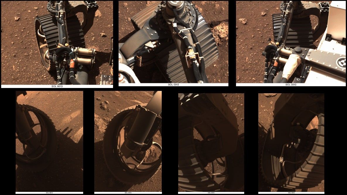 These sets of animated GIFs show seven views of NASA's Perseverance Mars rover wiggling its wheels on March 4, 2021, the day Perseverance completed its first drive on Mars.