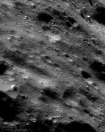 NEAR Shoemaker photographed this area of Eros on December 18, 2000, from an orbital altitude of 33 kilometers (21 miles). This part of the asteroid's surface, like many others, appears vaguely "sculptured" due to its low, elongated ridges and depressions with seemingly consistent orientations. Some of the low spots also contain accumulations of smooth, pond-like materials. Neither the surface sculpturing nor the pond-like materials are well understood, and both will be investigated in detail using even higher-resolution images from NEAR Shoemaker's low passes over Eros in early 2001. The whole scene is about 1 kilometer (0.6 miles) across.