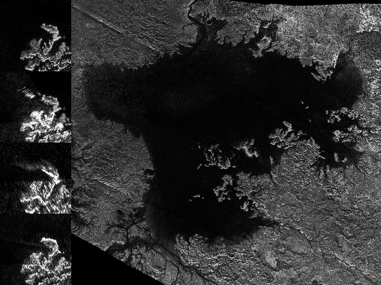 The large image panel shows Ligeia Mare in its entirety. Ligeia is Titan's second-largest liquid hydrocarbon sea, and has a total area of about 50,000 square miles (130,000 square kilometers), making it 50 percent larger than Lake Superior on Earth. This panel is a mosaic of five synthetic aperture radar images acquired by Cassini between 2007 and 2014. It shows a region approximately 330 by 305 miles (530 by 490 kilometers) in area.