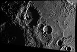 Scale: The large crater towards the decanter of the image is approximately 105 km (65 mi.) in diameter.