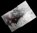 The mosaic is a high resolution close-up of two contrasting regions: dark Shangri-La and bright Xanadu. This view has a resolution of 1 kilometer (0.6 mile) per pixel and is centered at 2.5 degrees north latitude, 145 degrees west longitude, near the feature called Santorini Facula. The mosaic is composed of 10 images obtained on Oct. 28, 2005, each processed to enhance surface detail. It is an orthographic projection, rotated so that north on Titan is up.