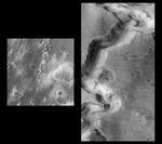 This picture of a canyon on the Martian surface was obtained a few minutes after 10 PM PST, January 8, 1998 by the Mars Orbiter Camera (MOC), during the 87th orbit around Mars of the Mars Global Surveyor spacecraft. It shows the canyon of Nanedi Vallis, one of the Martian valley systems cutting through cratered plains in the Xanthe Terra region of Mars. The picture covers an area 9.8 km by 18.5 km (6.1 mi by 11.5 mi), and features as small as 12 m (39 ft) can be seen. The canyon is about 2.5 km (1.6 mi) wide. Rocky outcrops are found along the upper canyon walls; weathered debris is found on the lower canyon slopes and along the canyon floor. The origin of this canyon is enigmatic: some features, such as terraces within the canyon (as seen near the top of the frame) and the small 200 m (660 ft) wide channel (also seen near the top of the frame) suggest continual fluid flow and downcutting. Other features, such as the lack of a contributing pattern of smaller channels on the surface surrounding the canyon, box-headed tributaries, and the size and tightness of the apparent meanders (as seen, for example, in the Viking image 897A32, left), suggest formation by collapse. It is likely that both continual flow and collapse have been responsible for the canyon as it now appears. Further observations, especially in areas west of the present image, will be used to help separate the relative effects of these and other potential formation and modification processes.