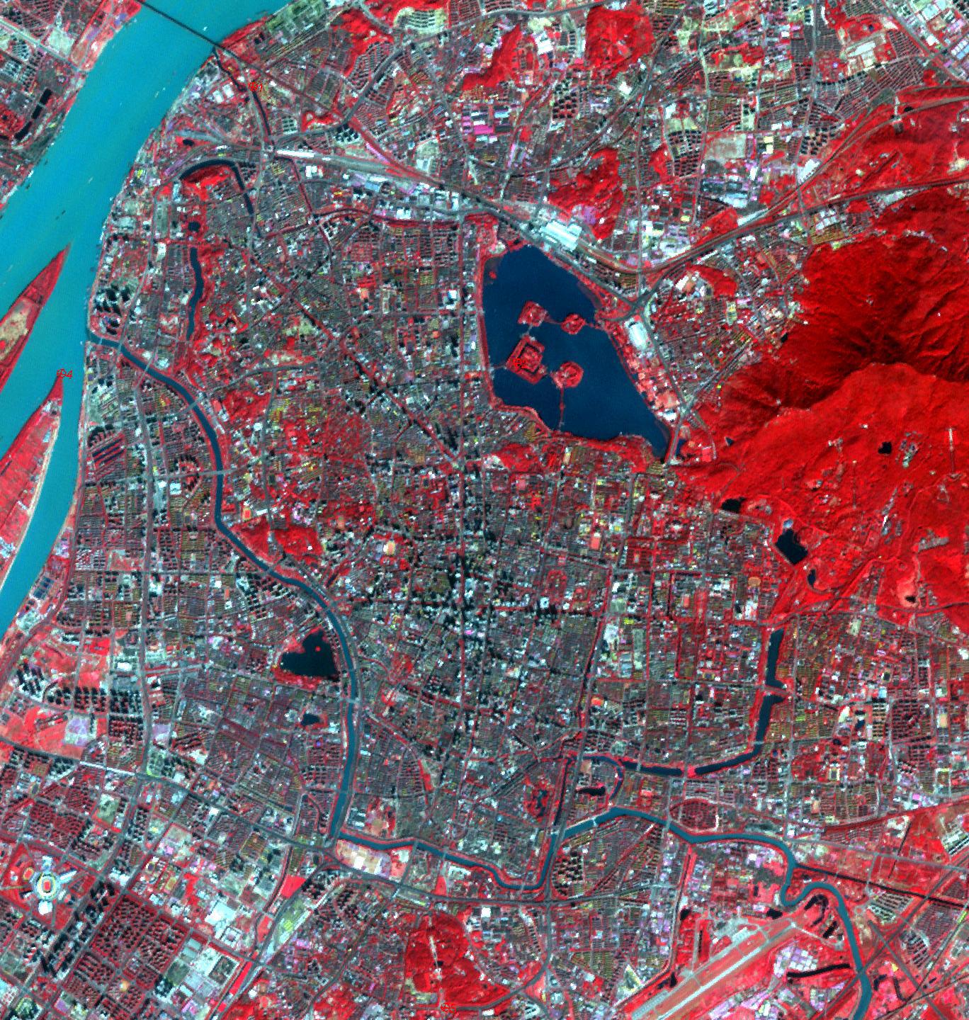 The largest city wall in the world is in Nanjing, China. It was built between 1366 and 1386 by the Ming Dynasty Emperor Zhu Yuangzhang to enclose and fortify his capital city. The wall is over 33 km long, is constructed from 350 million bricks, and is 14 meters wide, and 14-20 meters high. Its 13 massive gates today have been restored and house museums telling the story of the city of Nanjing. The ASTER image was acquired October 25, 2014, covers an area of 20.5 by 21.6 kilometers, and is located at 32.1 degrees north and 118.7 degrees east.