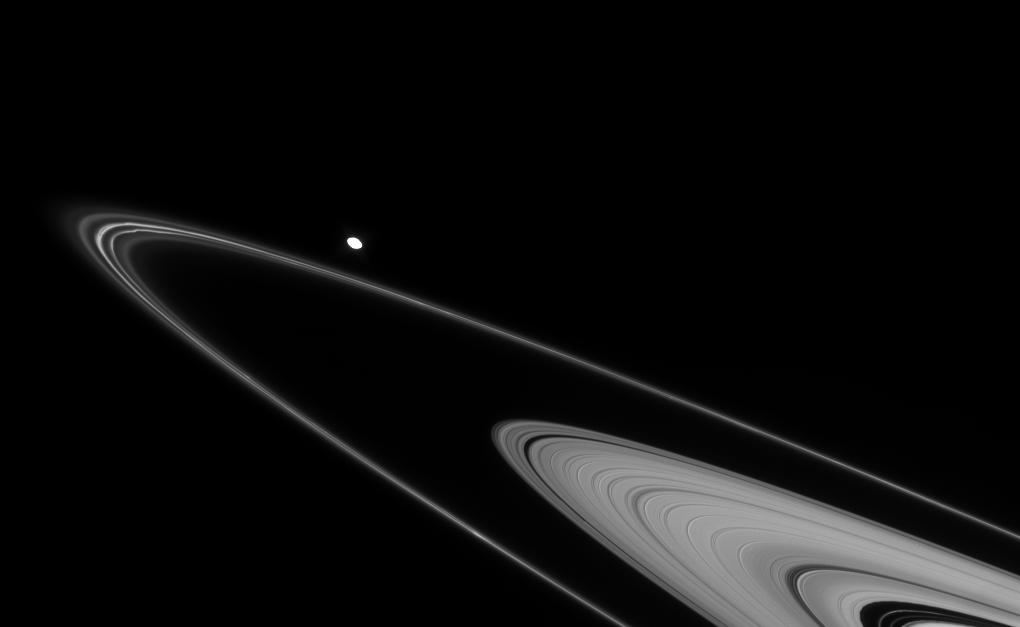 The oblong moon Pandora (84 kilometers, or 52 miles across) is overexposed in this image, due to the long exposure time necessary to see fine detail within the rings.