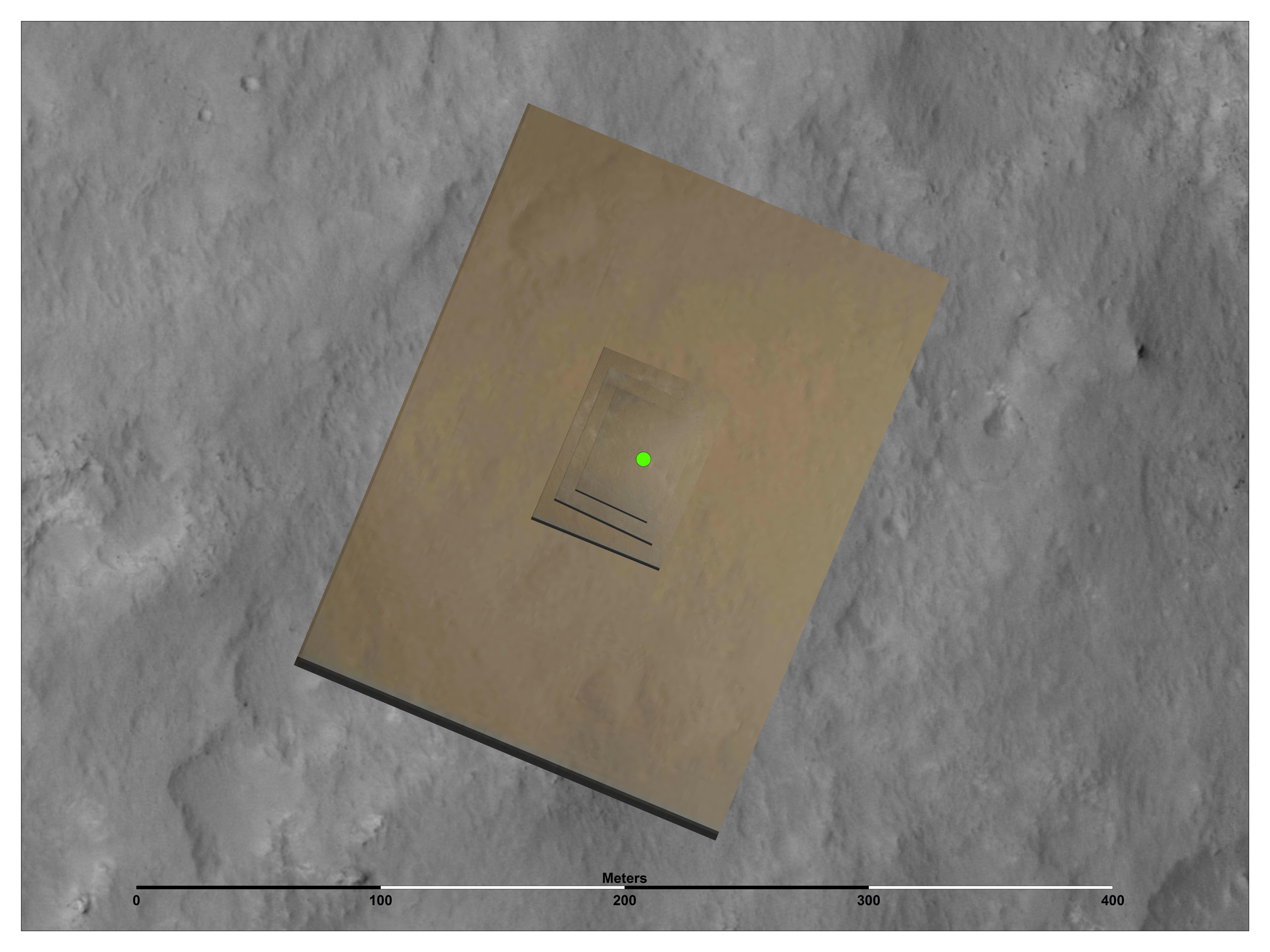 This image shows the location (green) where scientists estimate NASA's Curiosity rover landed on Mars within Gale Crater, based on images from the Mars Descent Imager (MARDI).