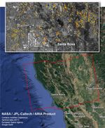 The map covers the area within the large red polygon, and measures 155 by 106 miles (250 by 170 kilometers). The illustrative figure from the map depicted in the inset shows damage in the city of Santa Rosa. Each pixel in the Damage Proxy Map measures about 98 feet (30 meters) across. The color variation from yellow to red indicates increasingly more significant ground surface change. Preliminary validation was done by comparing to optical satellite imagery from DigitalGlobe. This Damage Proxy Map should be used as guidance to identify damaged areas, and may be less reliable over vegetated areas. Sentinel-1 data were accessed through the Copernicus Open Access Hub. The image contains modified Copernicus Sentinel data (2017), processed by ESA and analyzed by the NASA-JPL/Caltech ARIA team. This research was carried out at JPL under a contract with NASA. For more information about ARIA, visit http://aria.jpl.nasa.gov.