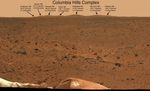 This image, taken from Spirit's PanCam looking east, depicts the nearby hills dedicated to the final crew of Space Shuttle Columbia. Arranged alphabetically from left to right - "Anderson Hill" is the most northeast of Spirit's landing site and 3 kilometers away. Next are "Brown Hill" and "Chawla Hill," both 2.9 kilometers distant. Next is "Clark Hill" at 3 kilometers. "Husband Hill" and "McCool Hill," named for Columbia's commander and pilot respectively, are 3.1 and 4.2 kilometers distant. "Ramon Hill" is furthest southeast of Spirit's landing site and 4.4 kilometers away.
